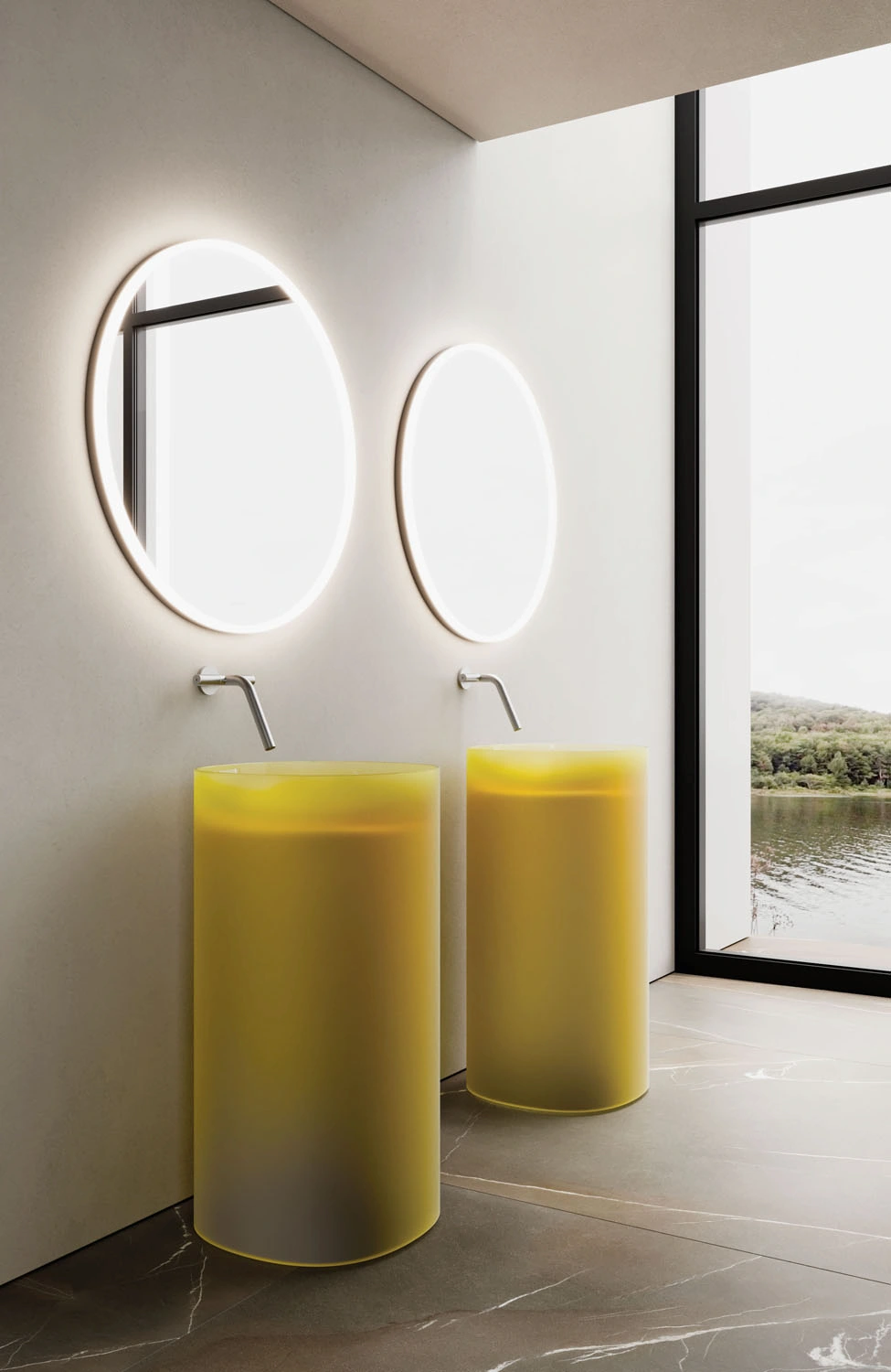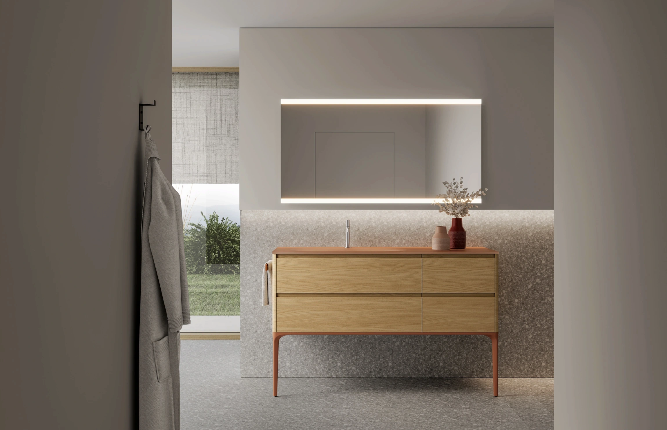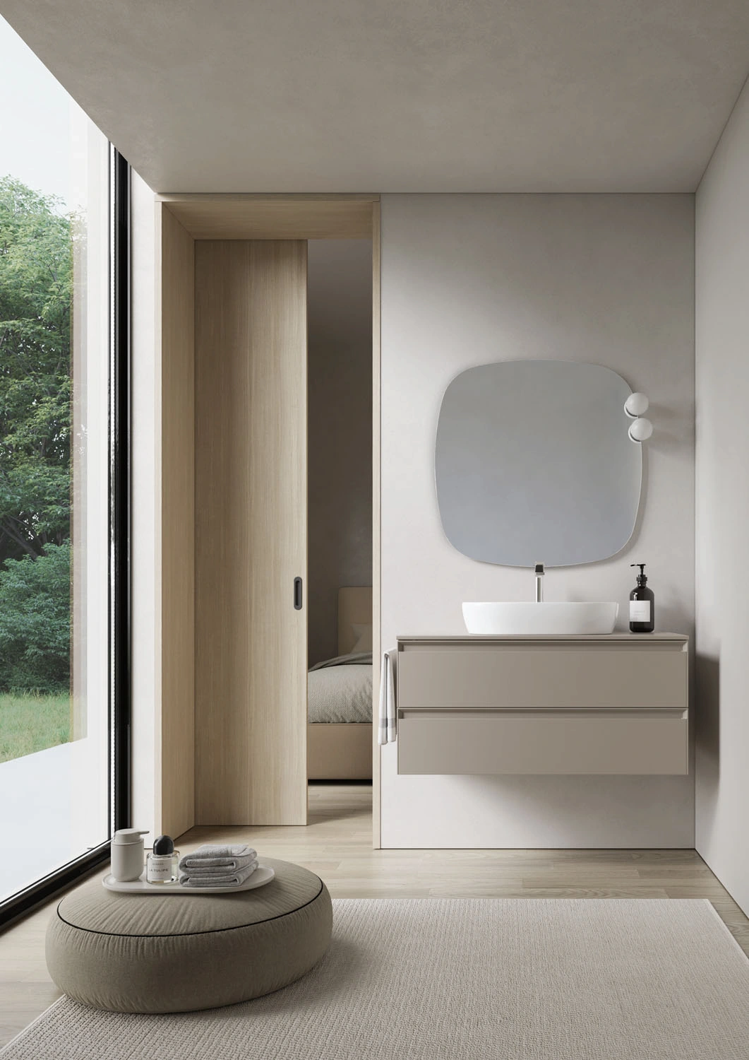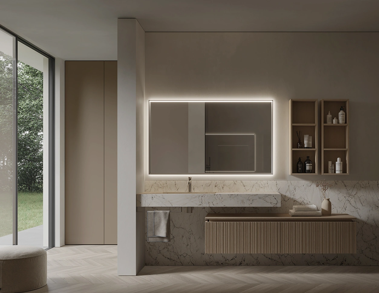 Le collezioni includono composizioni sospese o a terra, lavabi integrati o d’appoggio, pensili, colonne, specchi e illuminazione coordinata.