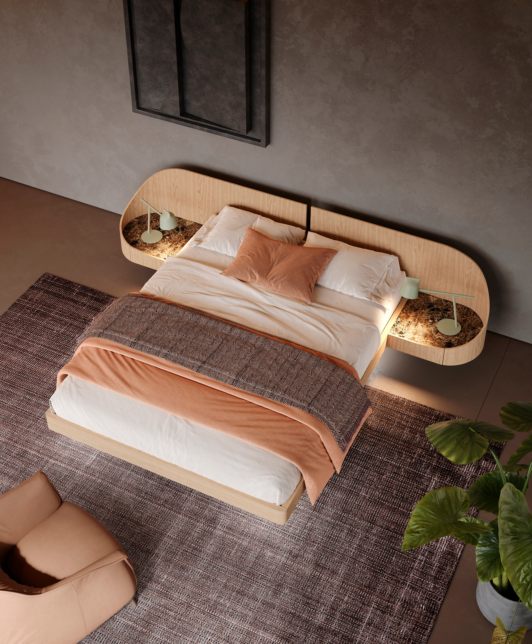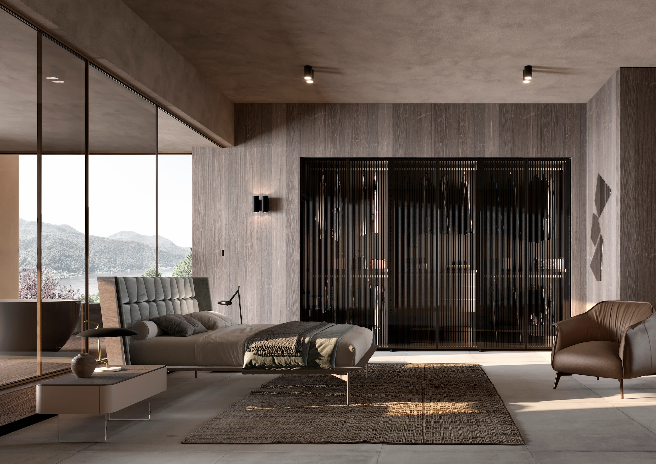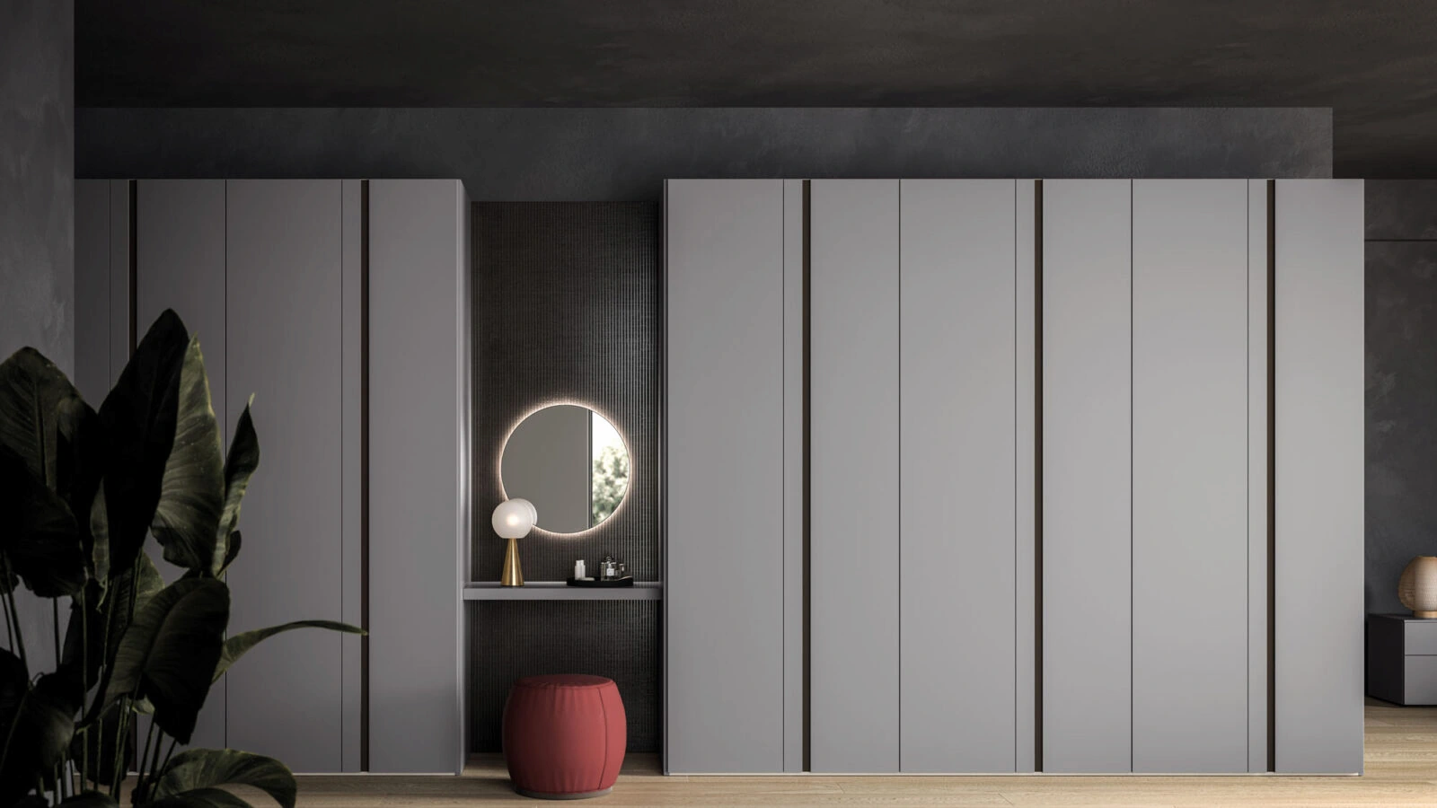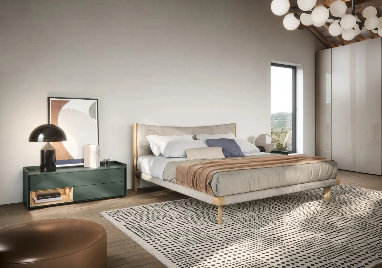 I letti possono essere completati con contenitore, ideale per chi desidera ottimizzare lo spazio. Gli armadi, grazie alle molte configurazioni interne, permettono di organizzare al meglio capi e accessori, con cassettiere, ripiani, tubi appendiabiti e illuminazione interna. Le finiture spaziano da materiali materici a tonalità più neutre, così da creare un ambiente rilassante e coerente.
