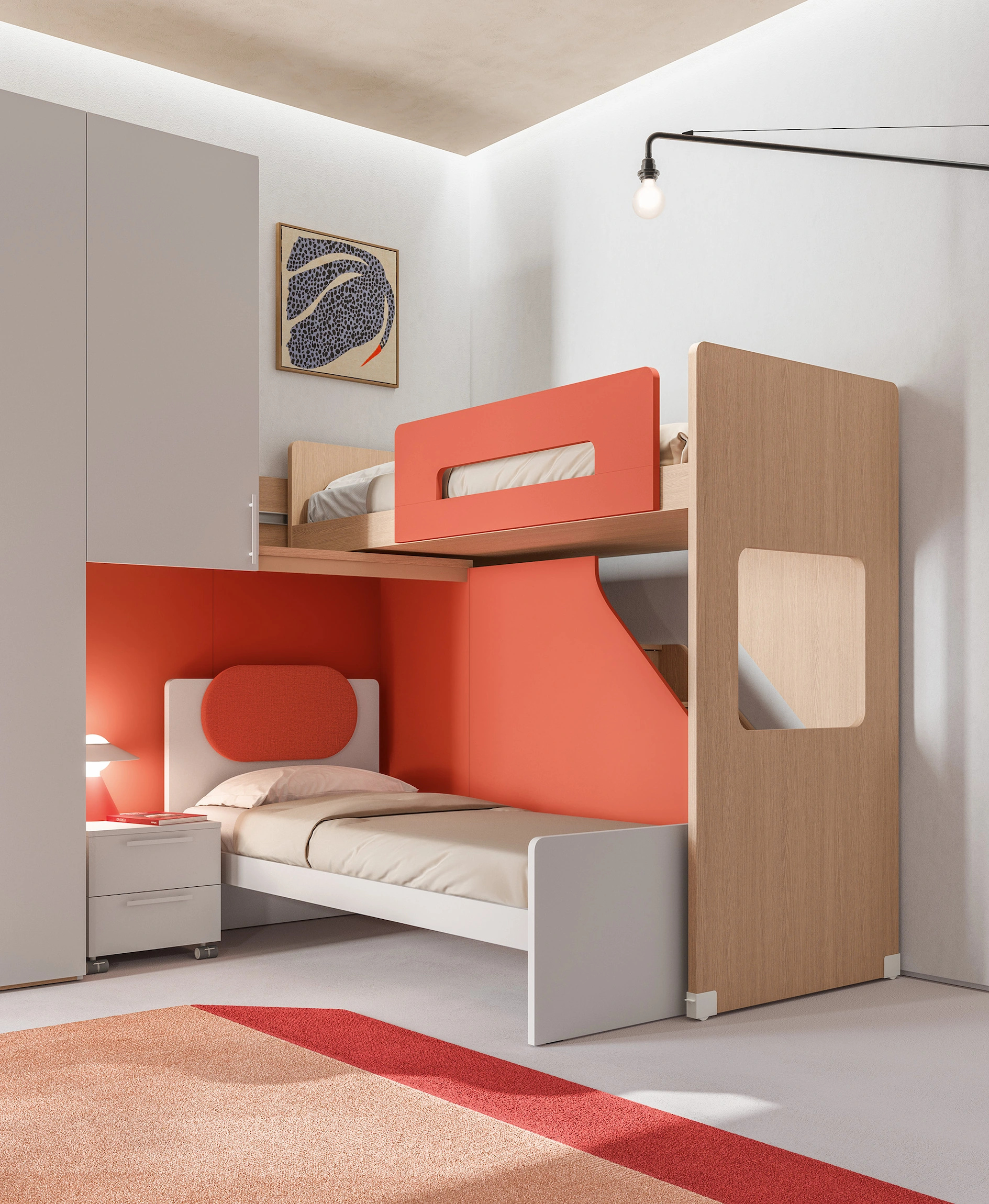 Le soluzioni salvaspazio offrono sistemi intelligenti che combinano letto, contenitori e piani di lavoro in un’unica composizione, perfetti per ottimizzare stanze di piccole dimensioni. I materiali sono selezionati per resistenza e sicurezza, mentre la varietà di finiture permette di creare atmosfere vivaci, stimolanti o più sobrie, a seconda delle preferenze.
