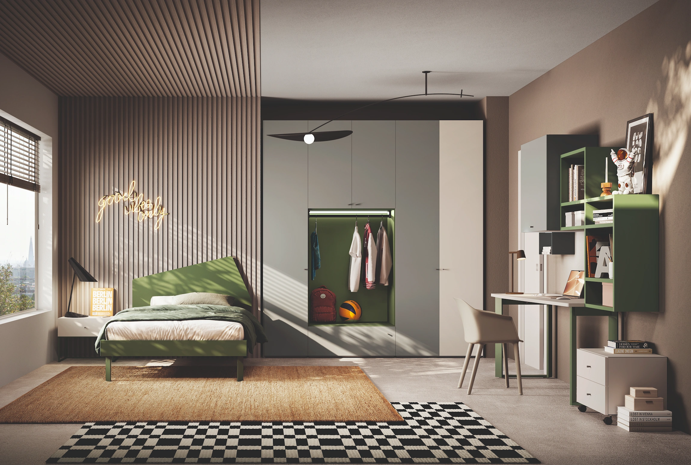 Per questo proponiamo camerette moderne, modulari e componibili che si adattano all’età dei bambini e accompagnano la crescita nel tempo. Le composizioni includono letti singoli, a castello, a soppalco o a ponte, armadi ampi, scrivanie ergonomiche e librerie personalizzabili.